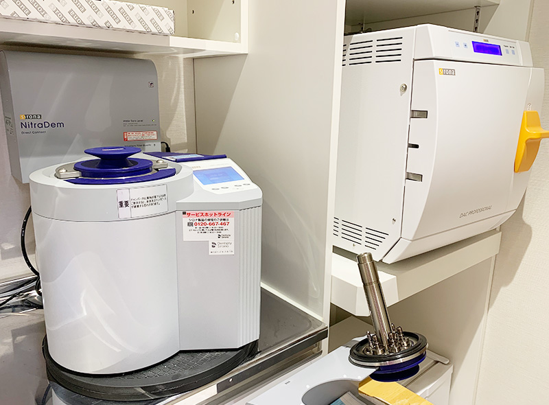 高圧蒸気滅菌器(オートクレーブ)を用いて、治療機器の細部まで徹底的に滅菌を行っています。治療ごとに滅菌器にかけることで、院内感染のリスクを最小限に抑えています。